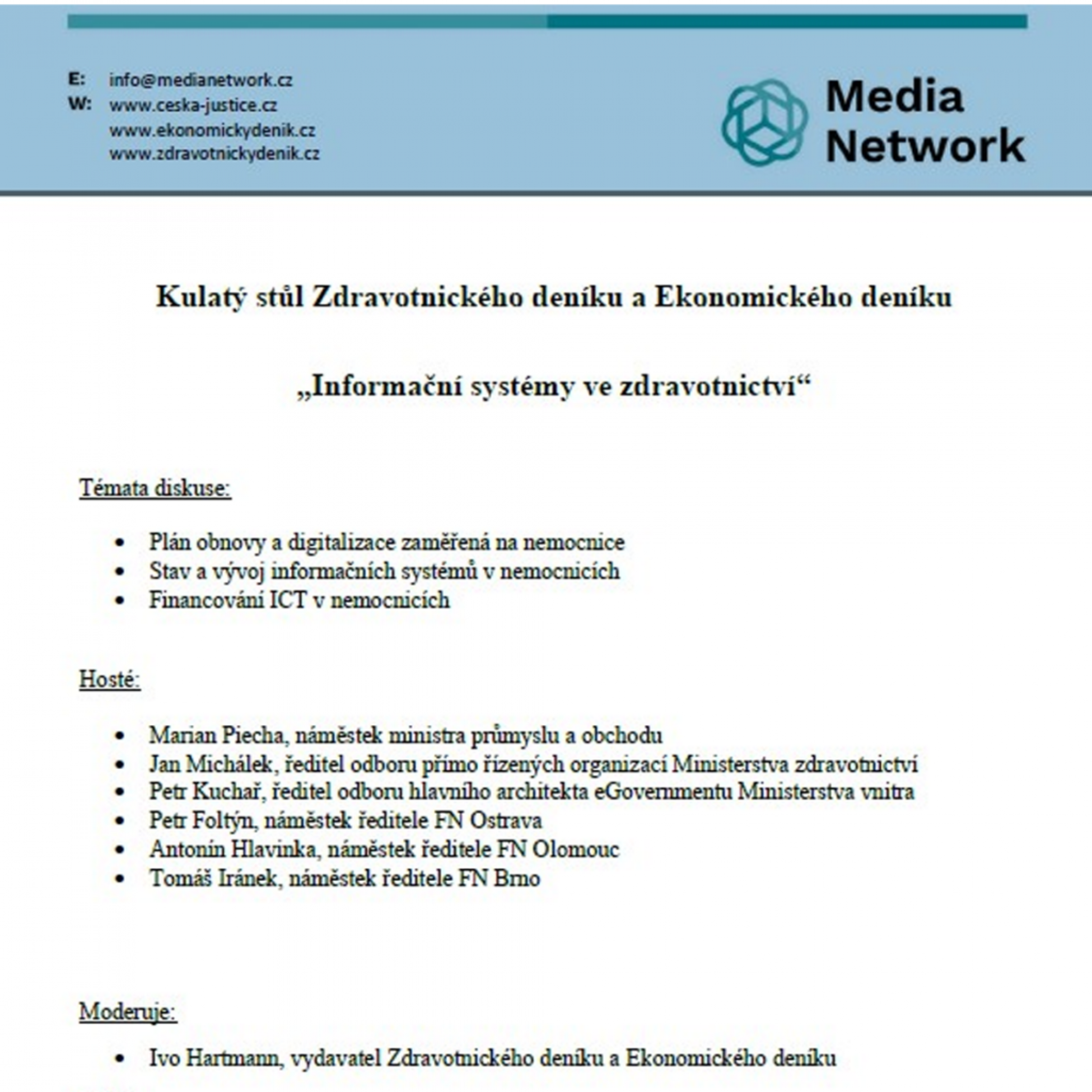 Kulatý stůl pořádaný Zdravotnickým deníkem a Ekonomickým deníkem se tentokrát věnoval tématům spojeným s informačními systémy ve zdravotnictví. Hovořilo se mimo jiné o plánech obnovy a digitalizace nemocnic, stavu a vývoje informačních systémů v nemocnicích či o financování ICT v nemocnicích.