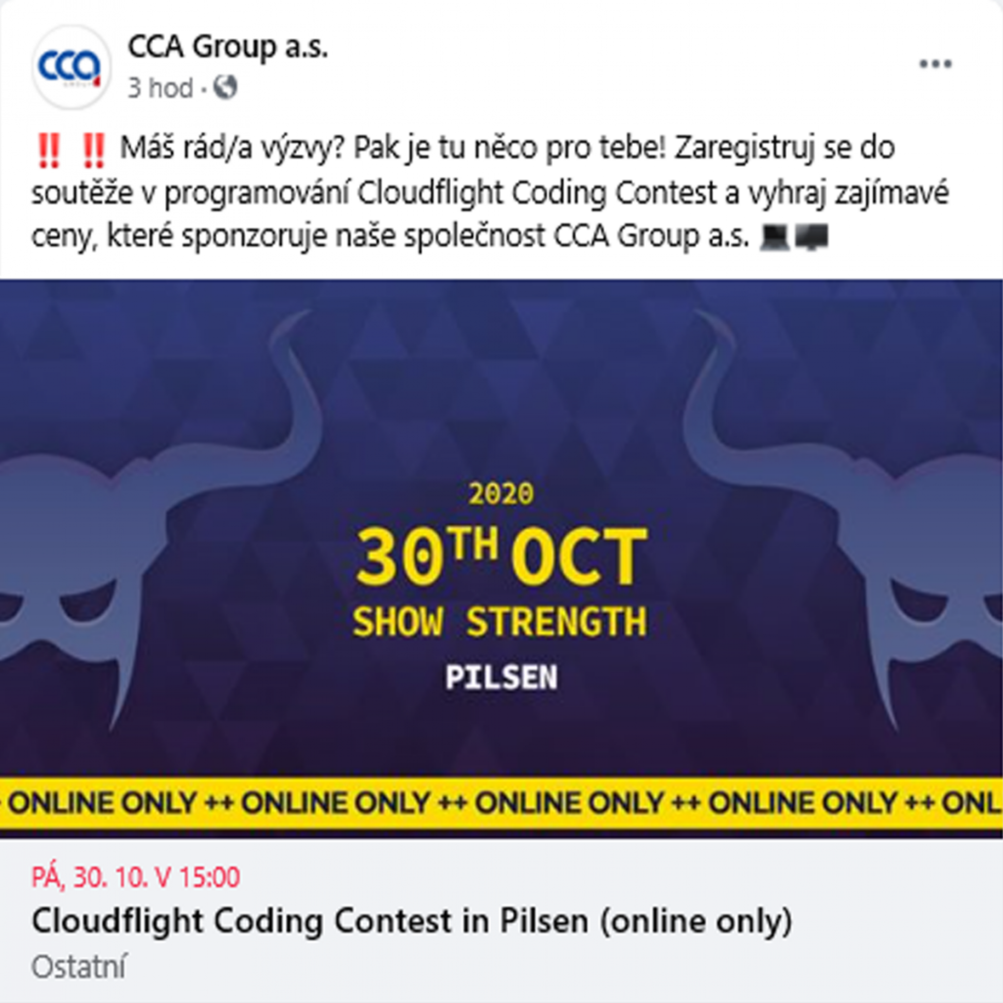 Naše společnost CCA Group a.s. sponzoruje soutěže v programování Cloudflight Coding Contest, kde se vyhrávají zajímavé ceny. Informace naleznete na facebookovém profilu společnosti zde.