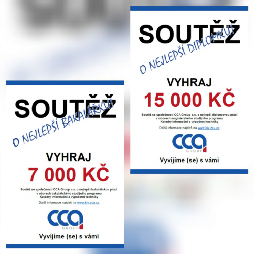Jelikož podporovat talenty se vždy vyplatí, tak i letos vyhlašujeme již tradiční soutěž pro studenty Katedry informační a výpočetní techniky Západočeské univerzity v Plzni. Soutěž je opět zaměřena obě kategorie. Nejlepší bakalářskou práci odměníme částkou 7.000,- Kč a autor nejlepší diplomové práce získá odměnu dokonce 15.000,- Kč. Více informací o soutěži jsou k dispozici na https://www.kiv.zcu.cz/cz/pro-studenty/souteze/ceny-cca.html Účastníkům soutěže přejeme hodně štěstí.
