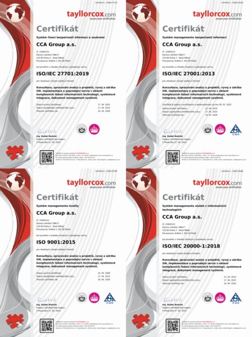 Úspěšně jsme obnovili ISO certifikáty CSN ISO 27701:2019, 27001:2013, ISO 20 000-1:2018, ISO 9001:2015 pro oblasti Konzultace, zpracování analýz a projektů, vývoj a údržba SW, implementace a poprodejní servis v oblasti komplexních řešení informačních technologií, systémové integrace a dokument management systémy s platností do roku 2026.