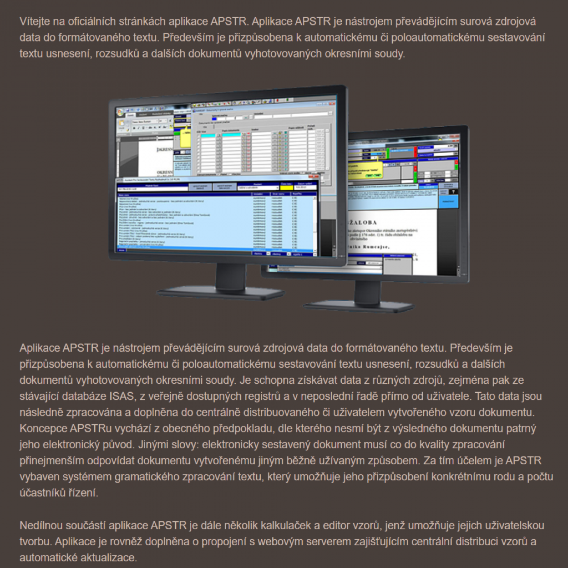 Naše společnost CCA Group a.s. uspěla ve veřejné soutěži na převzetí podpory a rozvoje systému APSTR, který zajišťuje efektivní tvorbu textů soudních rozhodnutí pomocí připravených sad textových šablon, která jsou doplněna specifickými daty z databází okresních soudů.